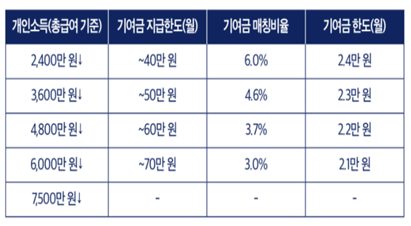 (1)개인소득과 납부 금액에 따른 차등 기여금 지급입니다. 아래의 표에서 매칭비율을 확인하시기 바랍니다.